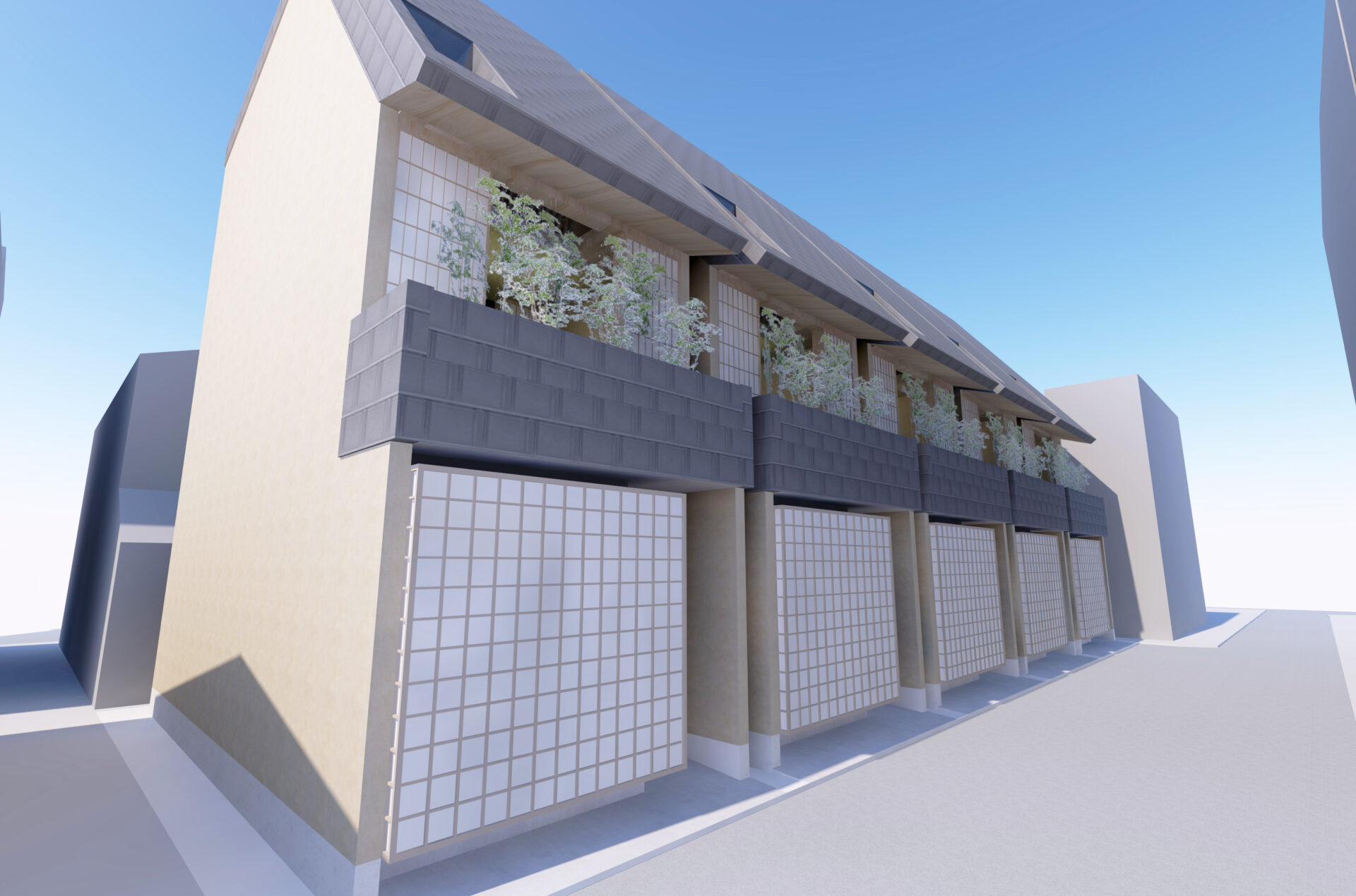 また、2階バルコニーに植栽を植えることで、5棟並んだ時のつながりが出るように意識しています