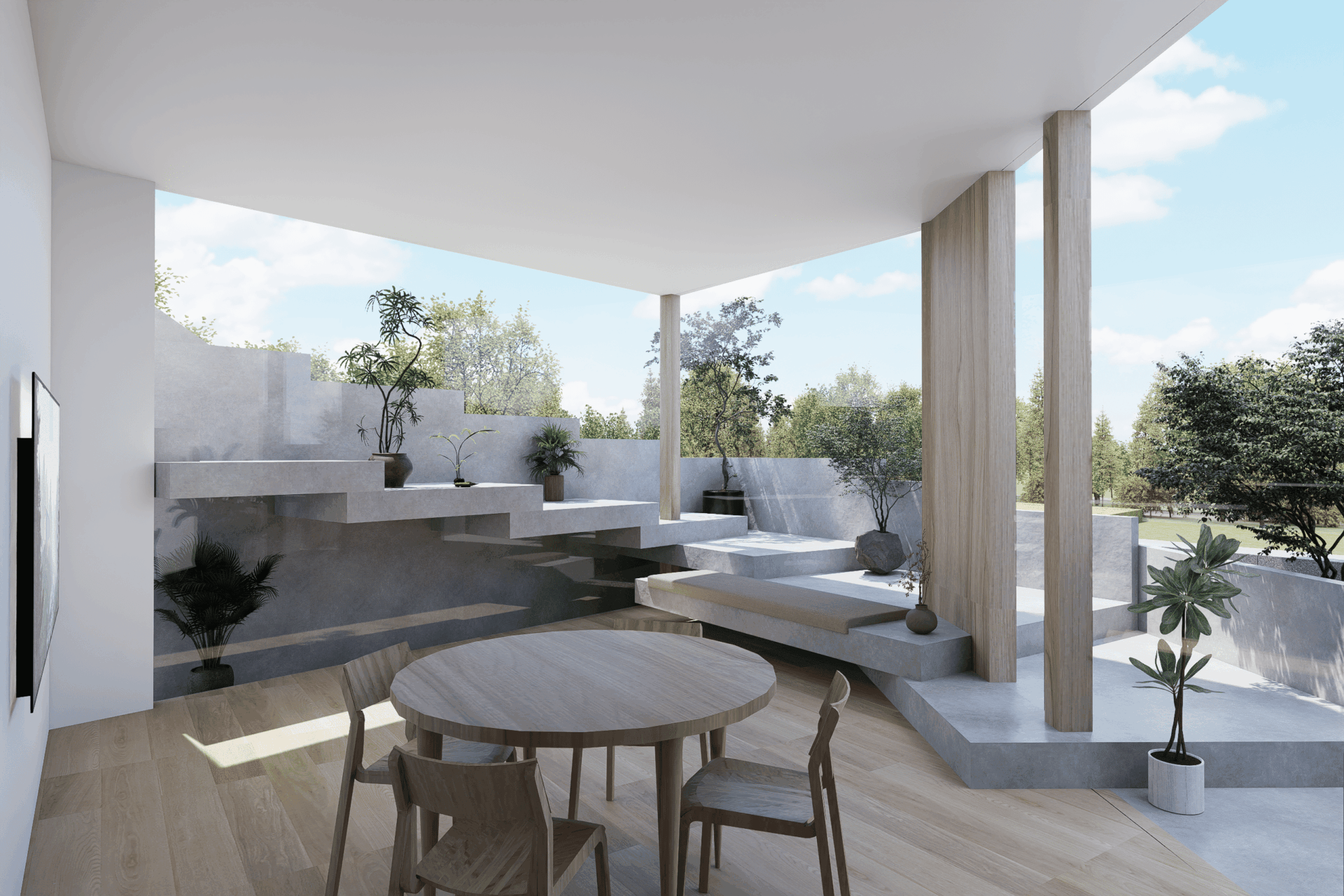 家を貫通し階段状に2階のバルコニーにつながっていきます。