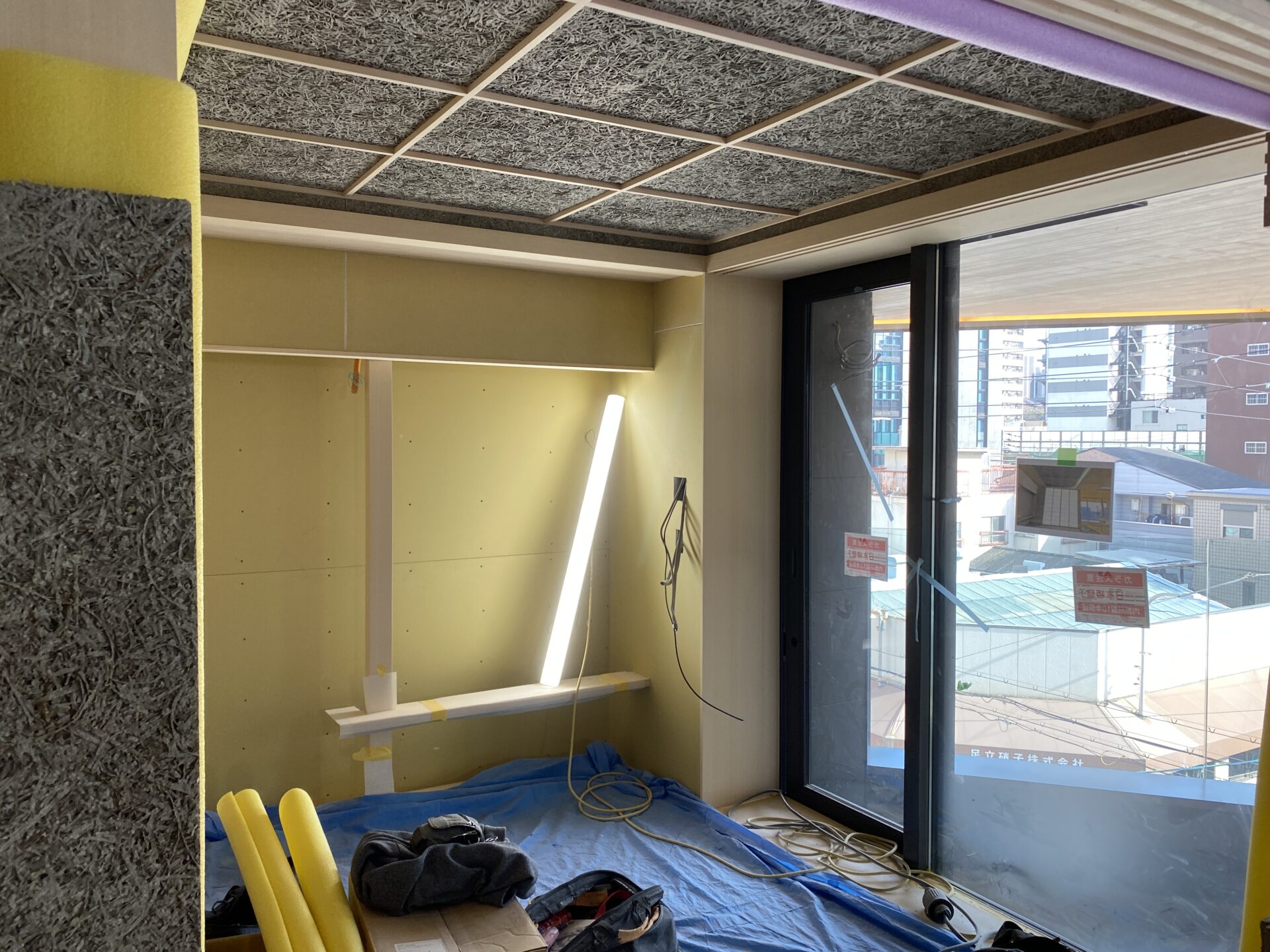 大阪:集合住宅 20251212 大阪:集合住宅 内装 大阪:集合住宅 内装 茶室のようなリビングがある部屋が仕上がってきていて、 壁も天井も扉も木毛セメント板という材でつくっています。 1枚1枚の板が微妙に表情異なり、見ていて面白いです。 もう少しで全体が仕上がりそうです。 内装工事 現場打合せ 設計事務所 設計事務所 大阪