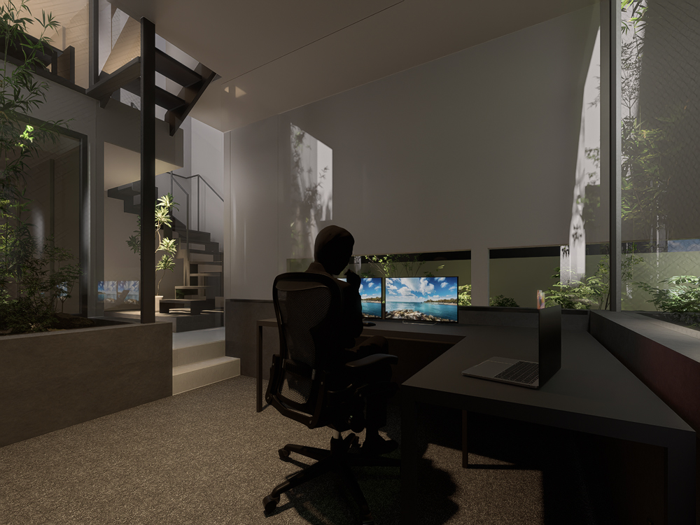 大阪:高槻の家4 20260211 大阪:高槻の家4 ワークスペース 庭に囲まれた在宅勤務のためのワークスペースです。 1階の床レベルから下げることで、視線の高さに庭が来るように調整しています。 日中ずっといる場所になりそうなので、閉塞感を感じない計画にしています。 CG コートハウス ワークスペース 中庭 大阪の建築家 大阪の設計事務所 大阪建築家 狭小住宅