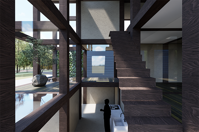 大阪:箕面森町の事務所 20260212 大阪:箕面森町の事務所 セカンドプレゼンの2案目です。 目の前に公園があるので、ジャングルジムのような形の 建物の中に、個室やキッチン、バルコニーやサンルームなど あちこちに配置してみた案です。 いかに外部空間を入れ込むかなどプランの検討に時間がかかりました。 CG 住宅設計 大阪 建築家 大阪 設計事務所