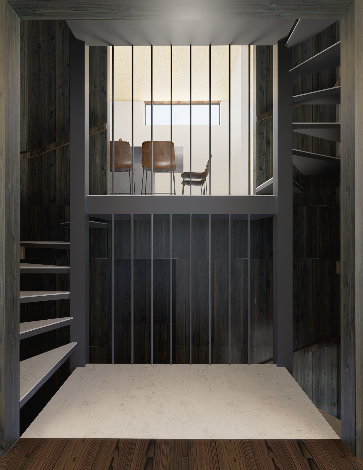 大阪:西成区の家 20260310 大阪:西成区の家 階段室 大阪:西成区の家 階段室部分の仕上げを検討しています。 画像の案は、黒く塗装した杉板を仕上げとしています。 階段室のBOX感を強調するために、 各部屋の階段室側の壁も同じ仕上げとしています。 大阪 住宅 大阪 住宅設計 大阪 建築家