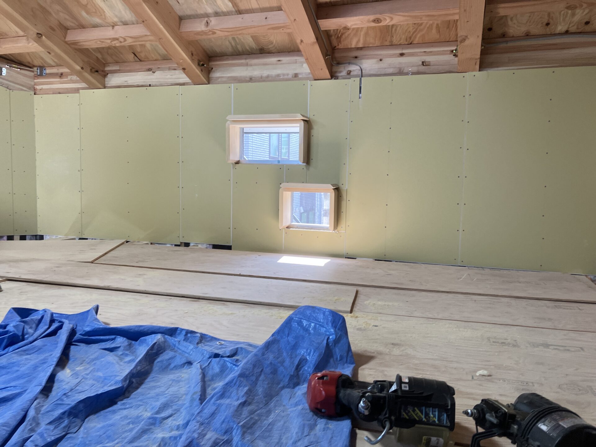 吹き抜けの上部に位置する窓なので臨時で床をはって作業しています。