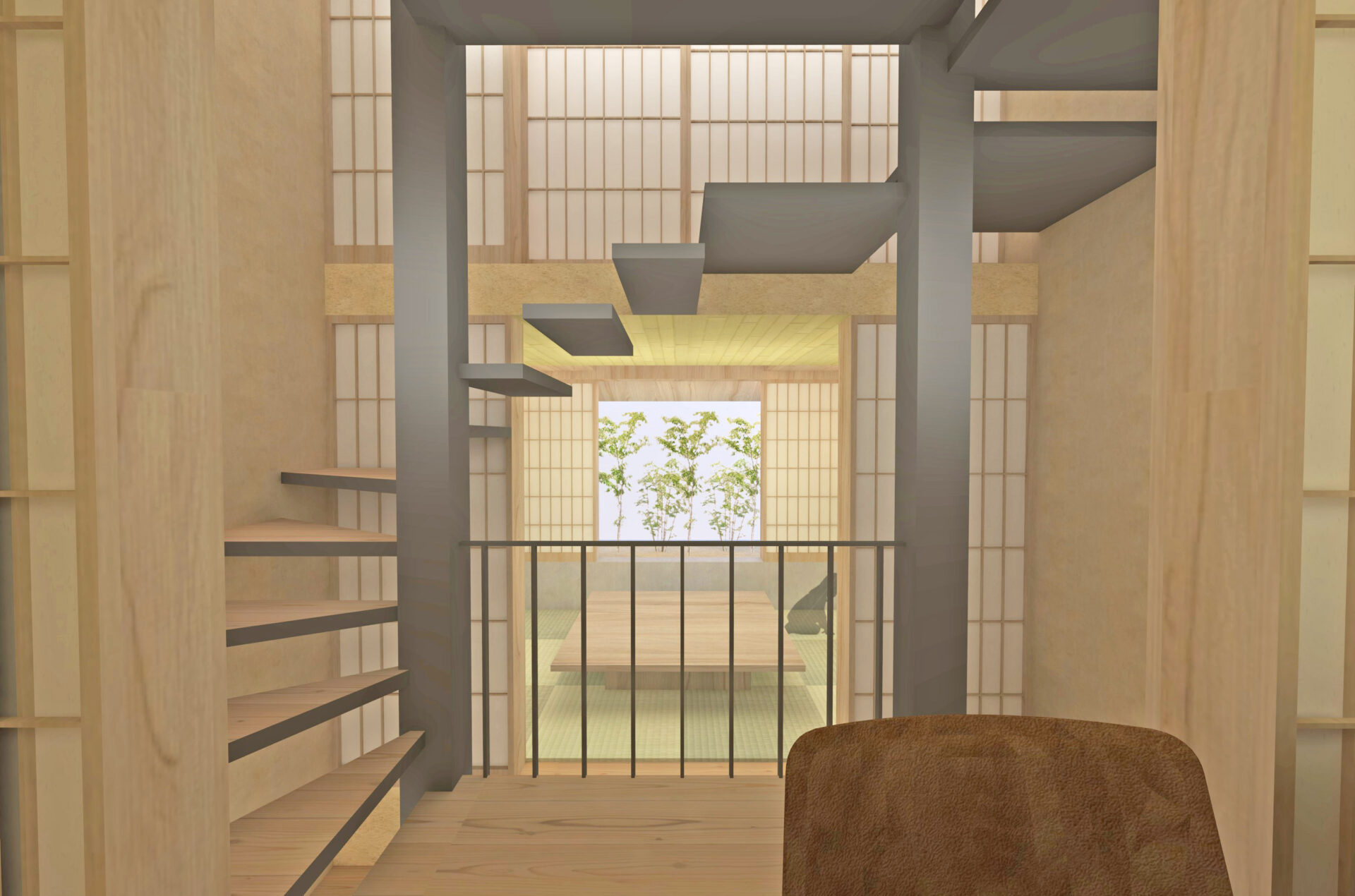 写真は南側のキッチンから北側のリビング(下)と個室(上)が見えている様子です。