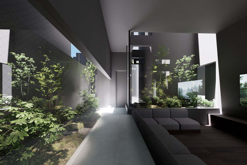 細長い敷地に建つ建物をくりぬいたように、中庭が入り込んだ住宅を提案しました。