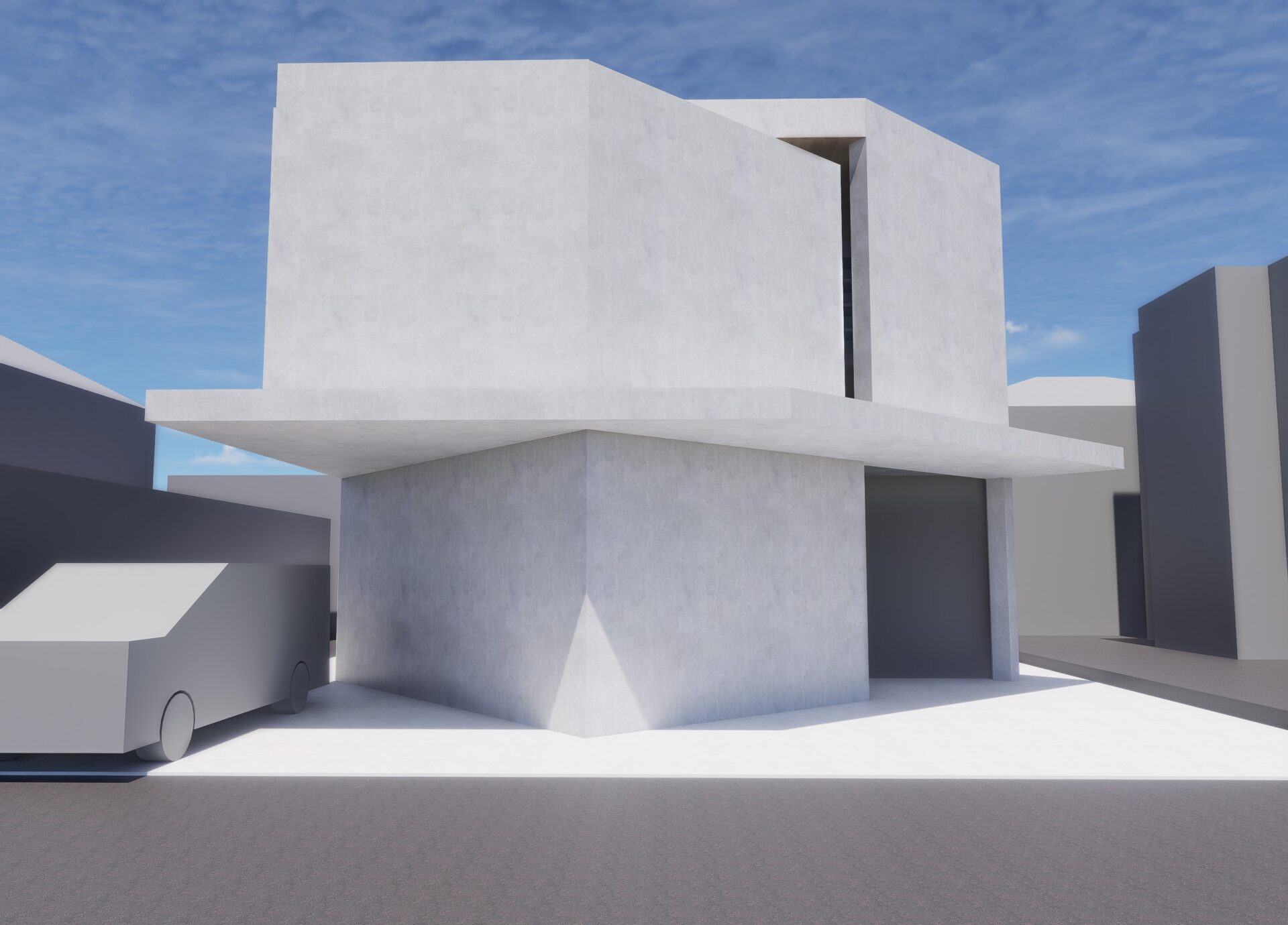 形状を模索した結果、2階のボリュームが1階の壁面より飛び出したかたちになっています。