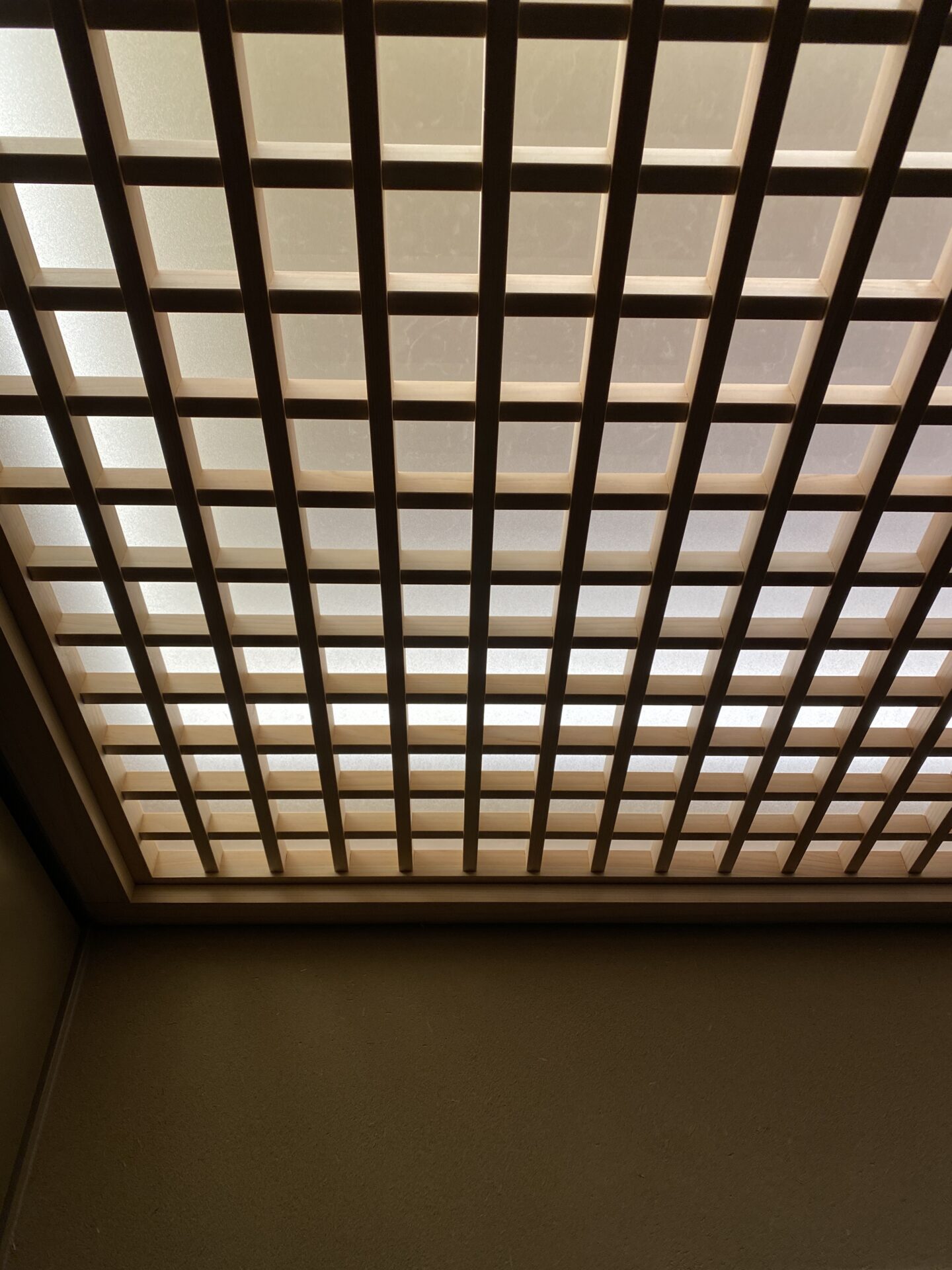 和の要素が強い部屋では写真のように半透明のアクリルを入れた格子天井にしています。