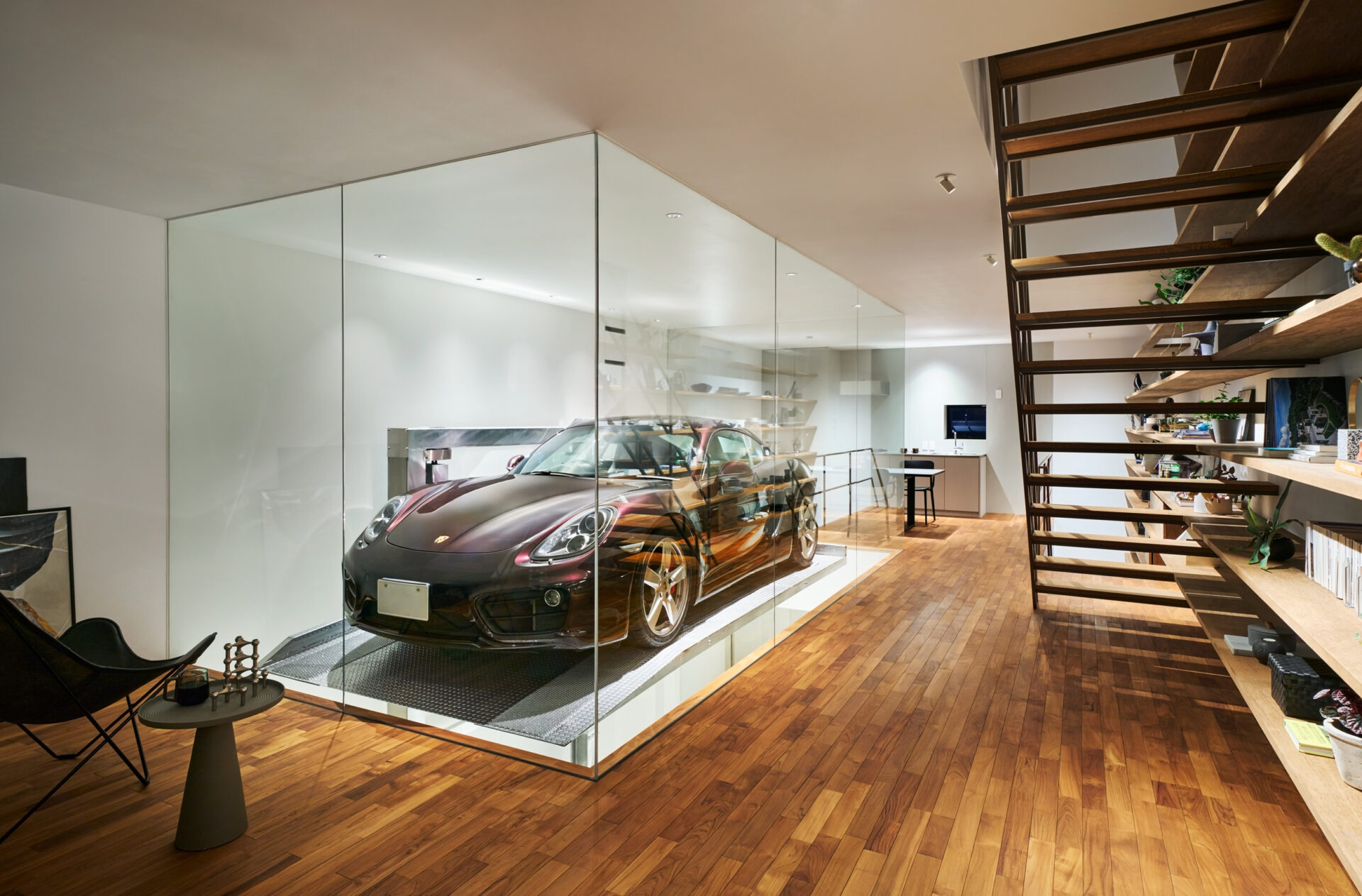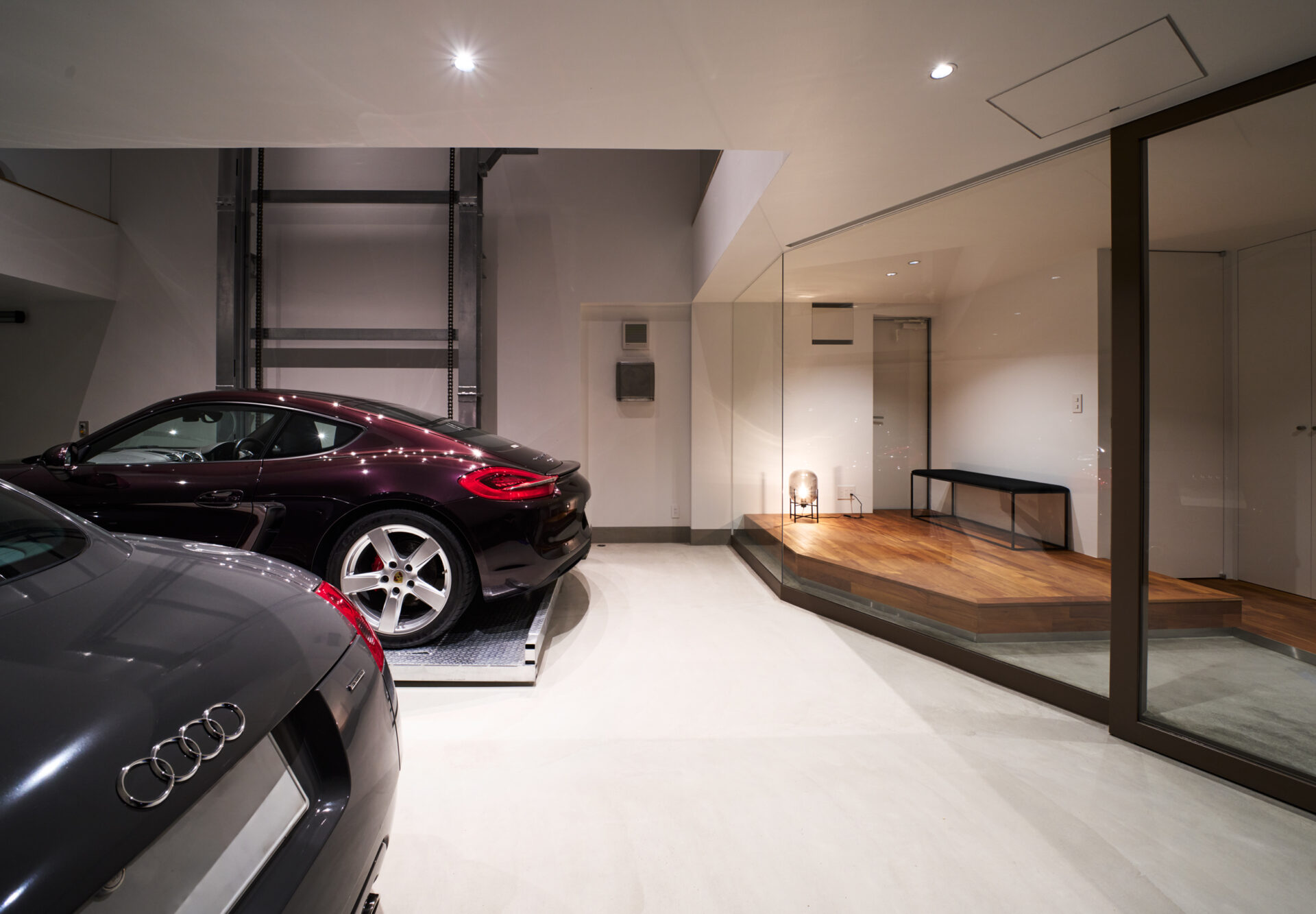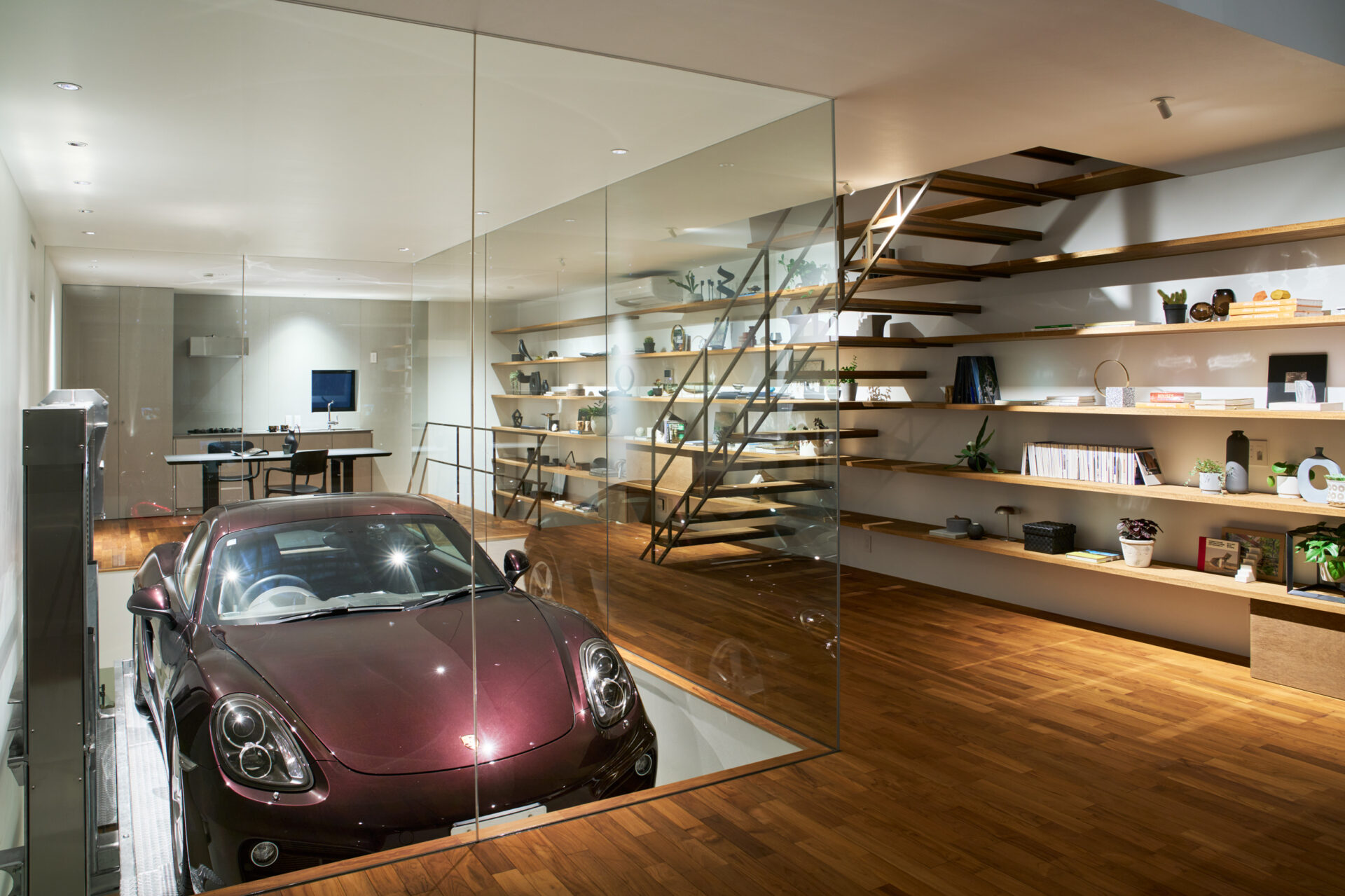 ガラス越しに様々な角度から愛車を眺めるという体験は、まさにオーナーのための特別な空間となっています。