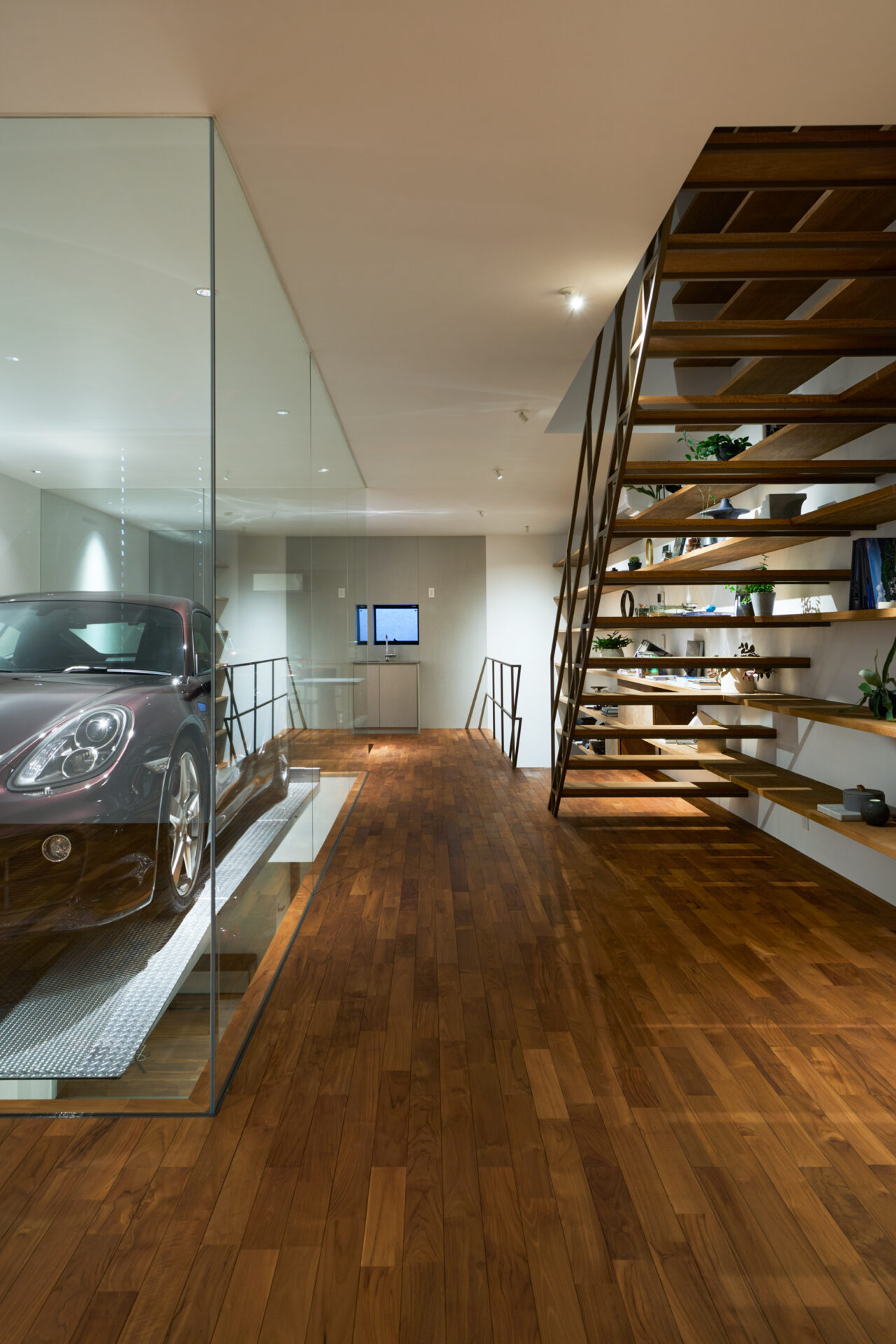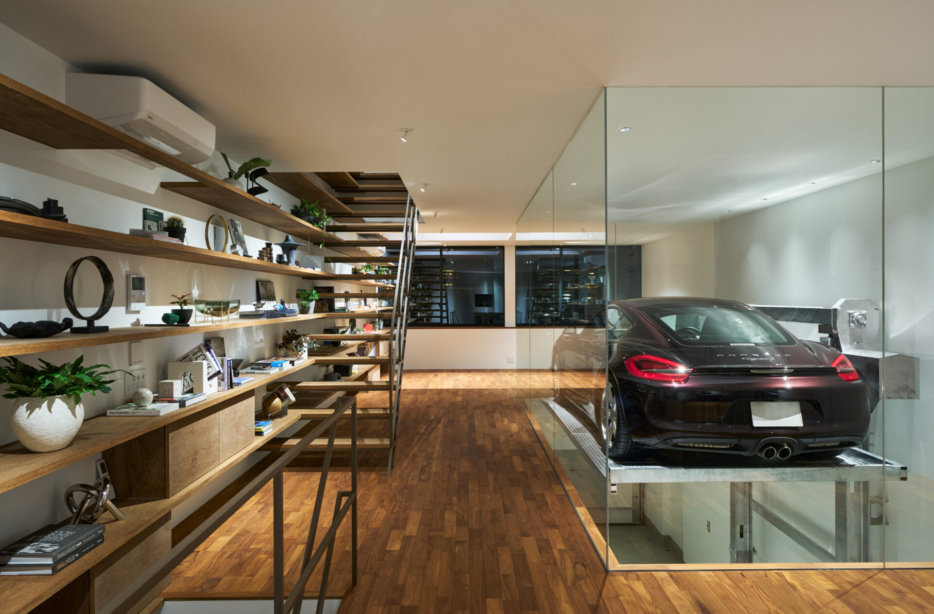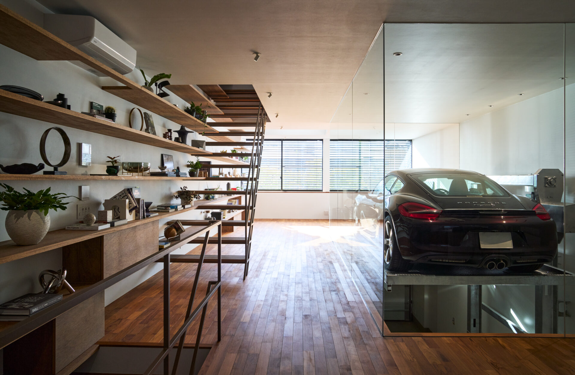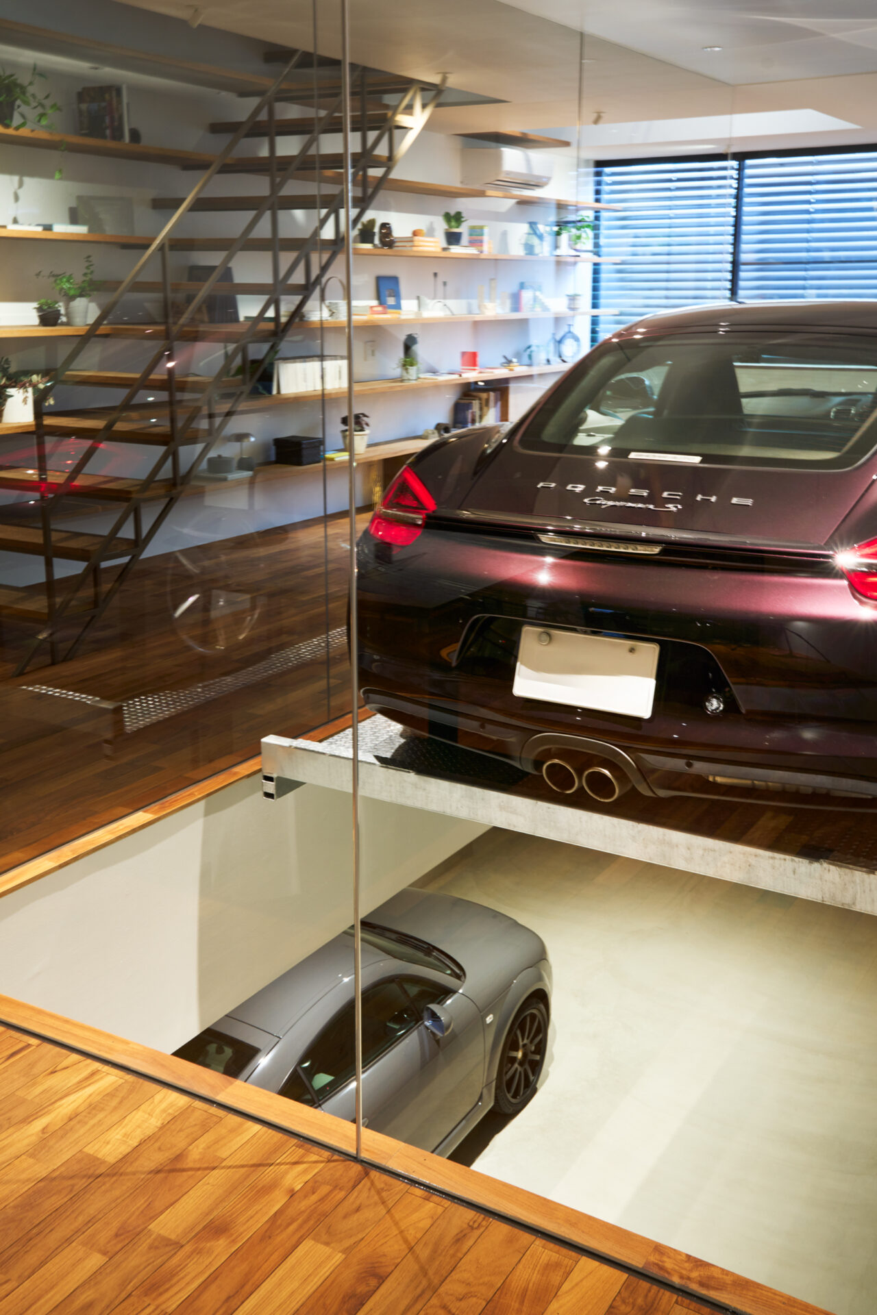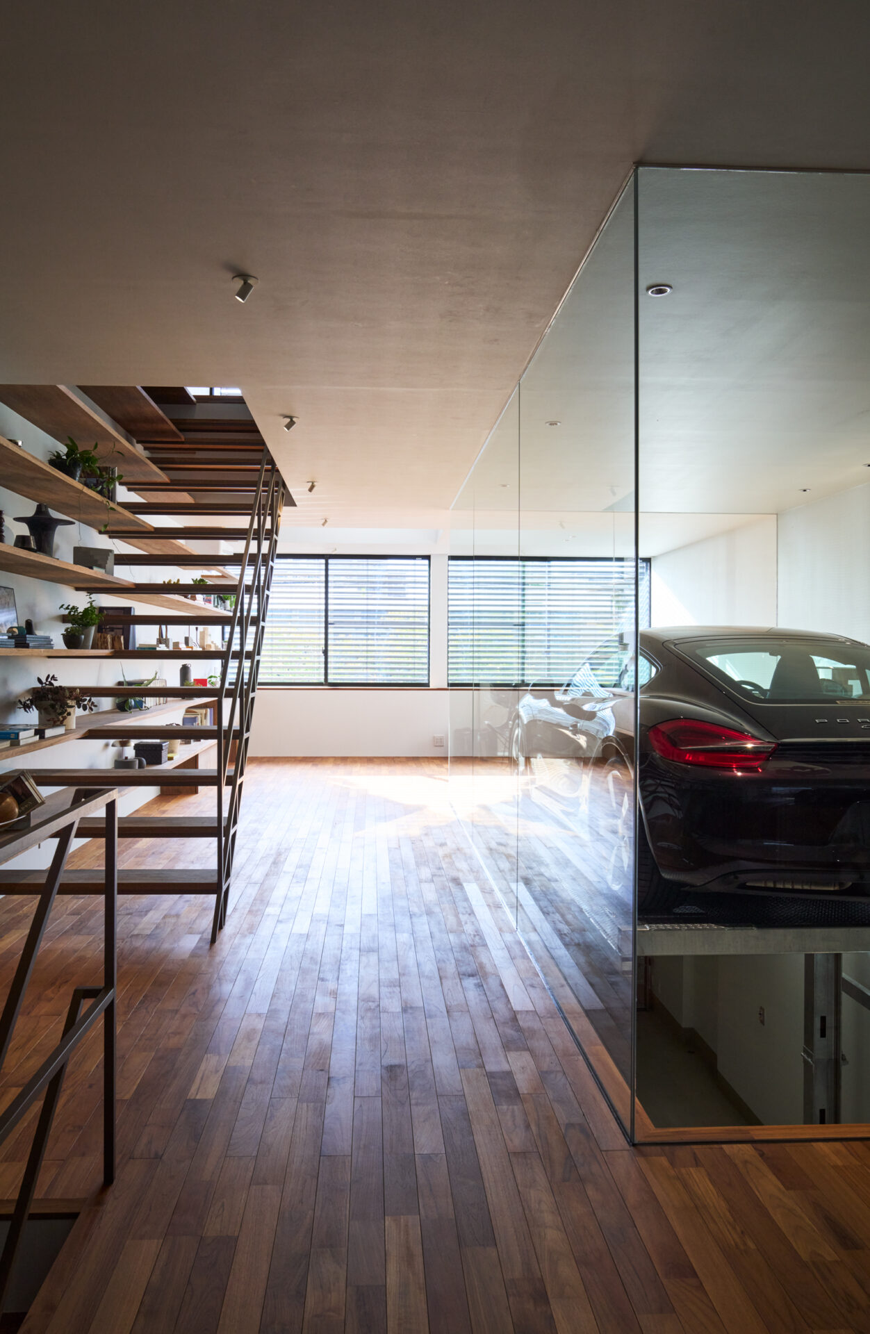 クライアントからの大きな要望は、車3台分のインナーガレージを設けることで、それらの愛車を室内から眺めたいという要望でした。