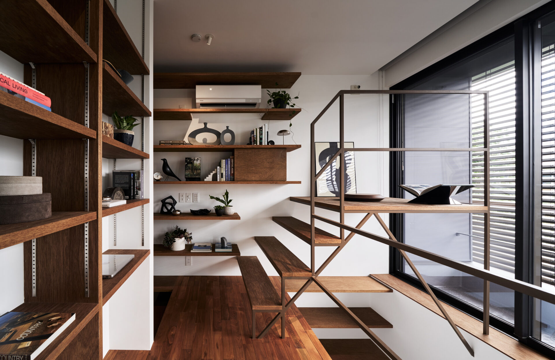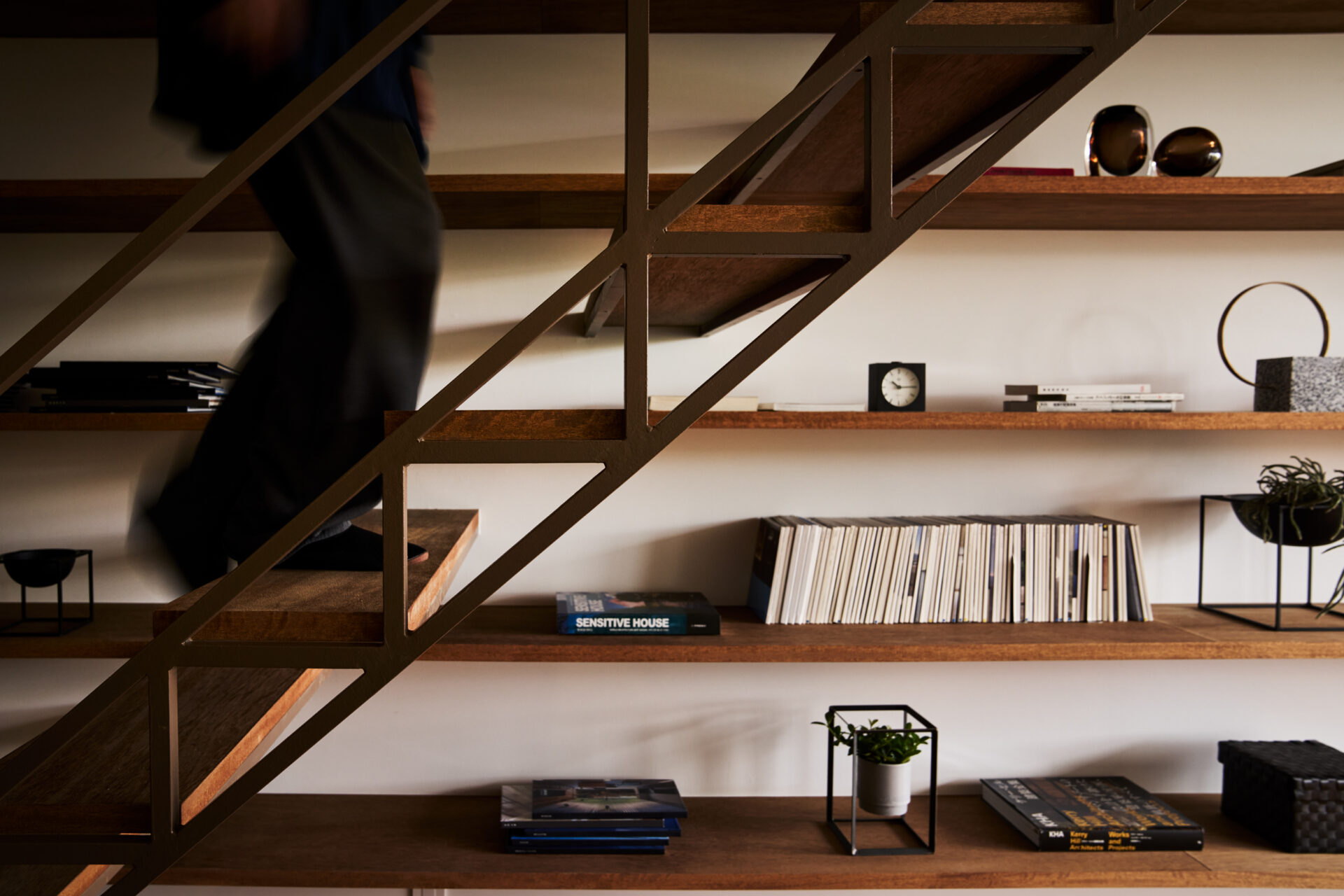 また、オーナーの趣味である書籍やコレクションを飾るため、1階から3階までの壁一面を棚として計画し、空間の奥行きを演出しています。