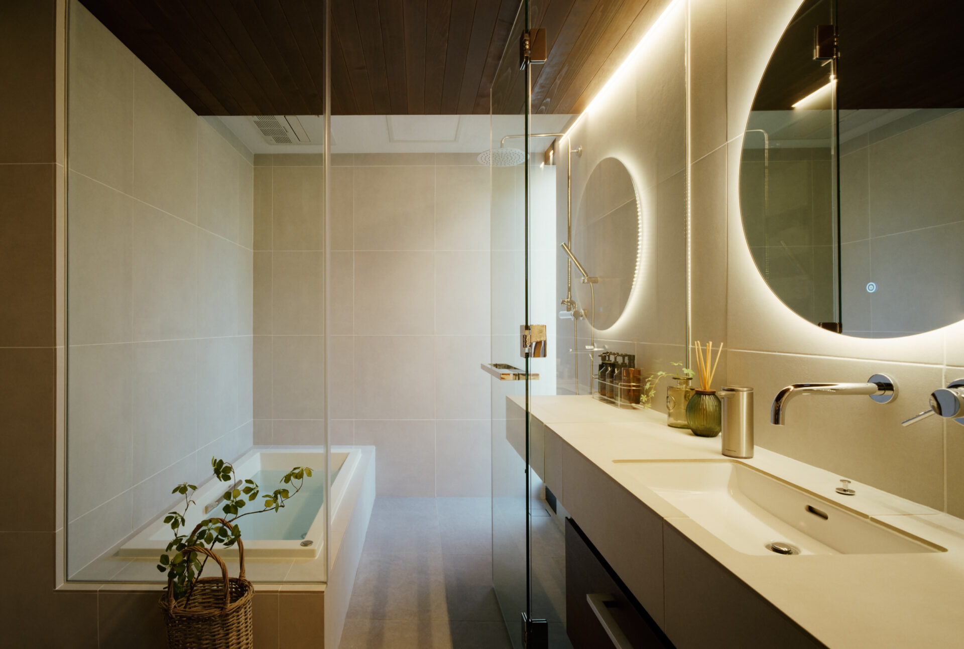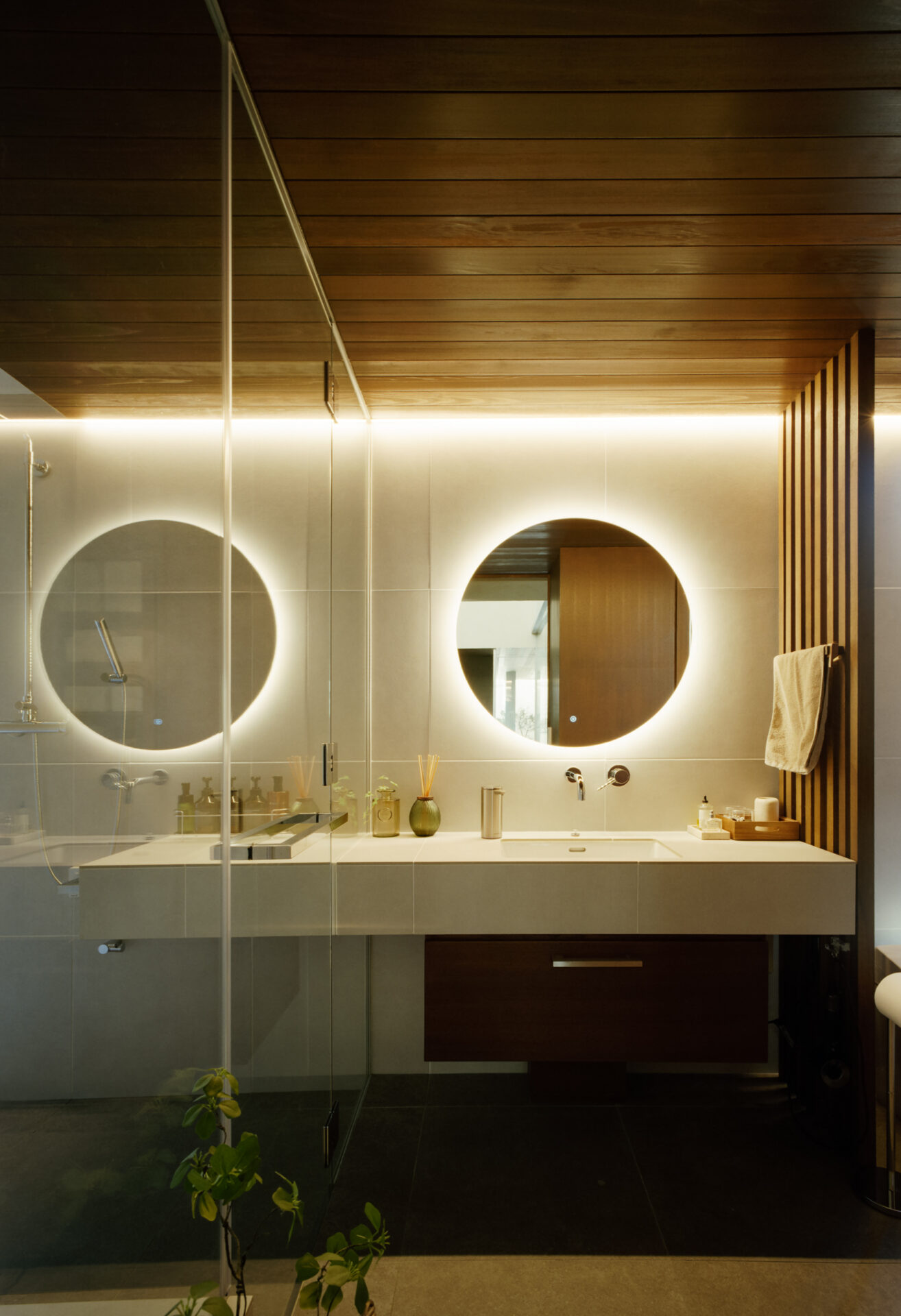 木やコンクリート、左官といったマテリアルに分けられたボリュームをずらして配置し、隙間から光や風を取り込む構成としています。